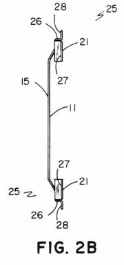A leaf spring made of a flat, thin, metallic strip comprised of an elongated flexible member with two parallel sides terminating at either end into flat rectangular, cross-like or circular shapes with a width approximately twice the width of the strip at its midpoint. The ends are crimped or cold pressed downward and then outward near their edges to form flanges. The crimped or pressed ends become each foot of the leaf spring.