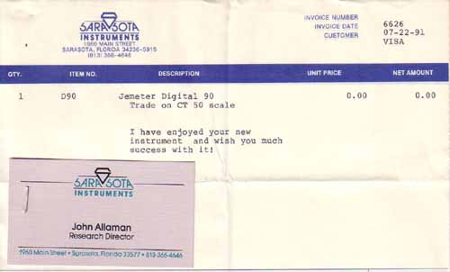John Allaman who founded Sarasota Instruments had a fascinating little digital wizardry for measuring refractive index (he called it "reflective index") called the Jemeter. We once swapped a Gemscale for one of his meters. He wasn't really a Beta Site, more like a friend in the business. He smartened up in life somewhere in the mid-90's, and switched to selling kayaks! By 2002, he had found yet a new career. In his words, "Yes I have moved in to Real Estate, no longer burdened by the weight of minerals, the vision of optics, the lugging out and putting back of Kayaks every day. Now I am a land trader selling swamp land in Florida." Go, John. The very best of luck to you.