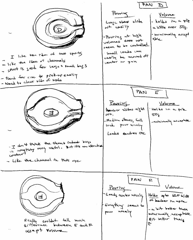 (November 1995) In the development process for the D500 weighing pan many many designs were considered and discarded. This gives a feeling for that process. In general none of the pans interact well with the cover. There is a need for a higher pan lip or thumb recesses in cover to allow a fully loaded pan to be picked up easily. The symmetrical, double spouted, pans work very nicely and are preferred by JB and I as a better idea. It’s a nice innovation to control pouring of large stones as well as small stones. And a modified internal contour is preferable when it helps center the load (as in pan E ) but allows stones to flow out smoothly (as in PAN F).