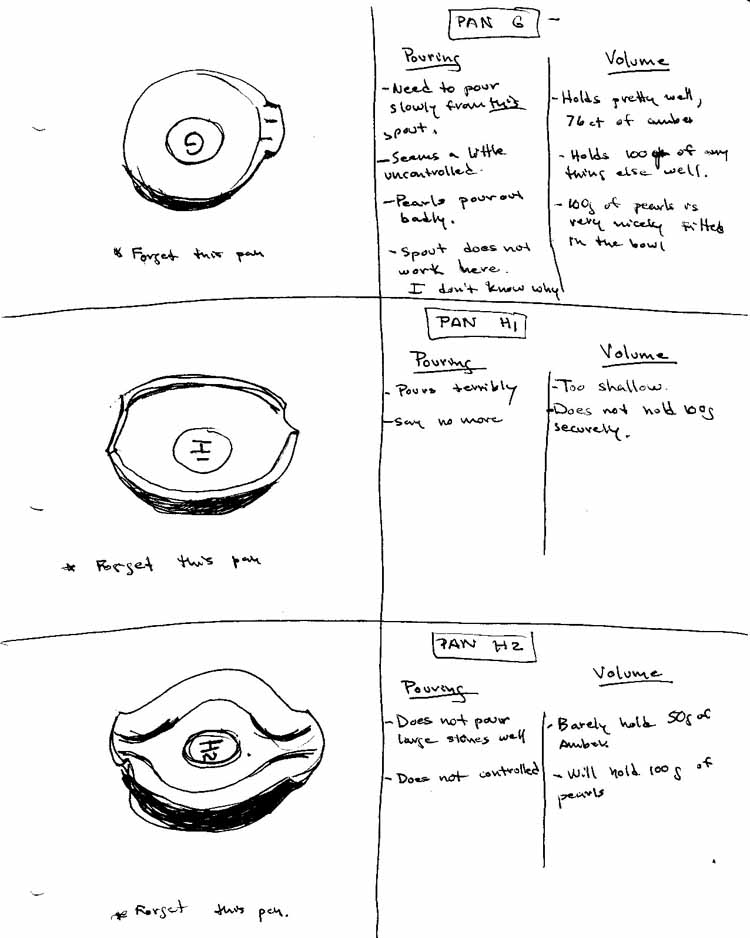 PAN A/ is a promising pan. It holds 100g of amber piled up carefully. It will hold every other material nicely and easily. It needs a weight locating area. The angle of the slope of the bowl is a bit steep as an excessive angle is required to get the last stones out at the end of a pour. Internal contouring as done in pan E and Pan F would help. Also I would like to see the slope of the smaller spout eased from this to something like this. An edge around the rim would make it much easier to pick up from the scale.