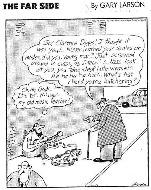 Fred Miller was an exquisite classical cellist. He played for us once (twice?) during his interment down in the basement. But he would have been a gruesomely demanding teacher! Someone had marked up this Gary Larson cartoon to tease him. You must surely check out ...