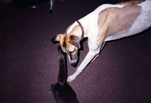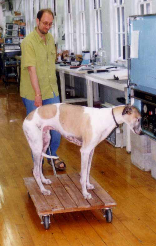 Happy's life pretty much paralleled that of Dendritics as a production company. He was born May 24, 1992. Joined us in September 92 as a rare greyhound puppy aged only 15 weeks. Celebrated his 10th birthday in May 2002 and died July 28, 2002. He was a major force in our interviewing process, passing judgment on one and all without concern for political correctness. You had to at least think he was OK, or how could you survive? Irina and her daughter were initially terrified of dogs, but he won them over with his sweet side.