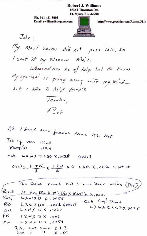 The Basic Formulas are courtesy of Robert J. Williams, Ph.D.,G.G. ... Rockhound, Jewelry, Appraising, Retired appraiser of Antiques, Gemstones, and personal property, Author of program Gemstone, which covered over 650 minerals, and all gemstones... a compilation of formulas, data, and instructions for gemologist, mineralogist, and jewelers. Much of the basic data used in the Dendritics Automated Calculations page is courtesy of Bob Williams.