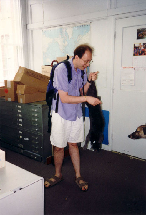 Squirkel had an amazing penchant for being carried by his rear legs. Perhaps he liked the blood in his brain? It is hard to decipher this image, but I am rubbing his belly. Happy looks on with a worried look. Happy and Squirkel were best of friends.